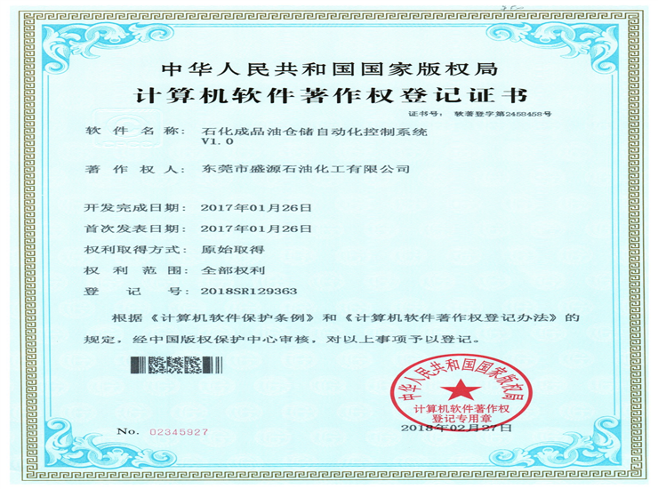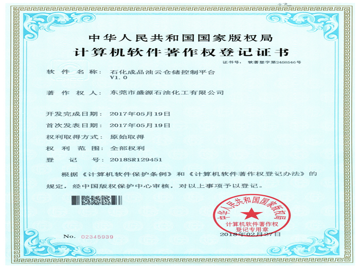 石化成品油倉儲云控制平臺著作權(quán)登記證書Click for larger image