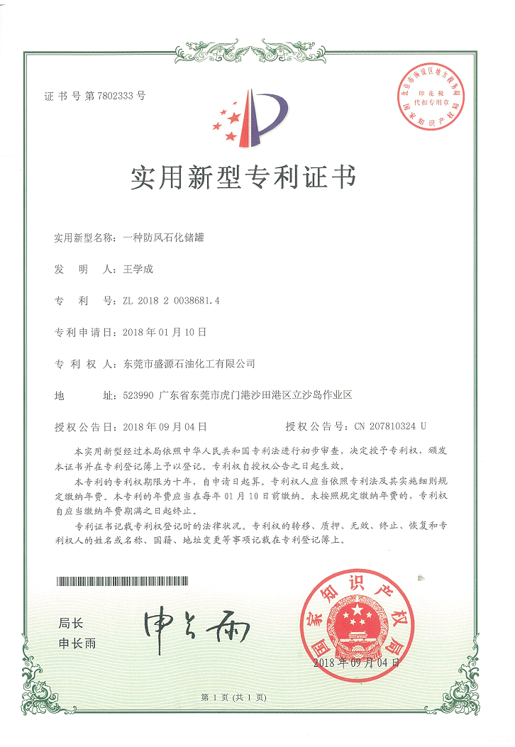 實(shí)用新型防風(fēng)石化儲(chǔ)罐專利證書Click for larger image