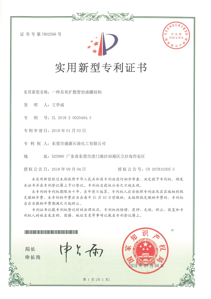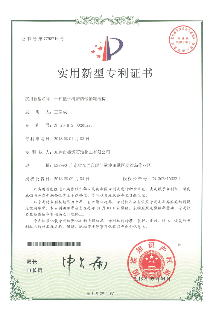 實(shí)用新型油罐結(jié)構(gòu)專利證書Click for larger image