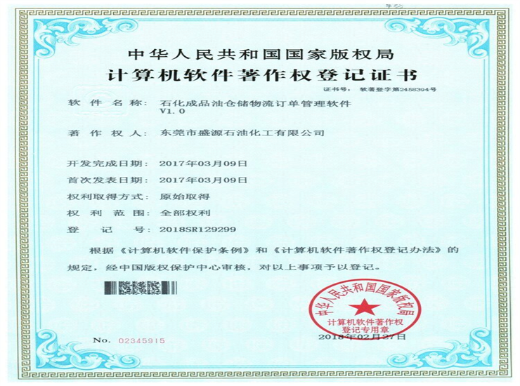 石化倉(cāng)儲(chǔ)物流訂單管理軟件著作權(quán)登記證書Click for larger image