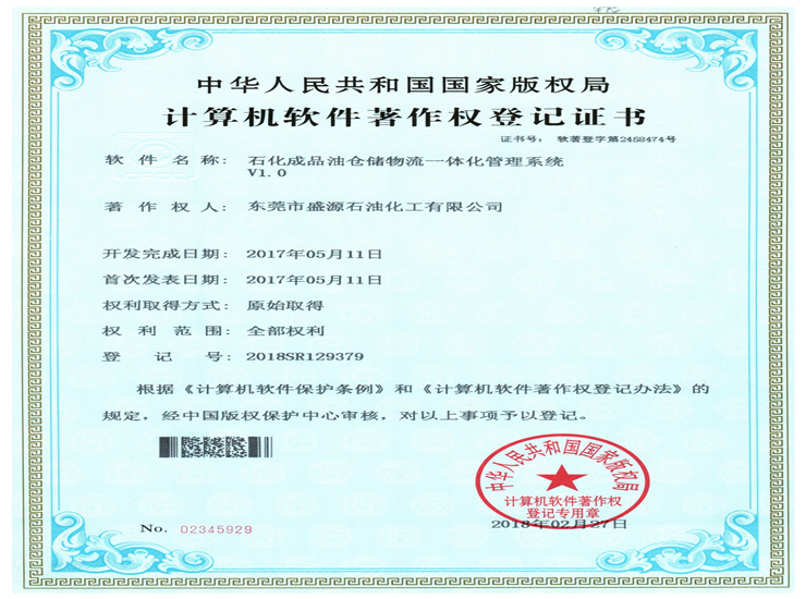 石化倉(cāng)儲(chǔ)物流一體化管理系統(tǒng)著作權(quán)登記證書Click for larger image