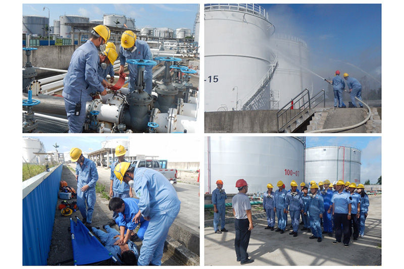 上午9:00,15號罐進(jìn)出油短管發(fā)生泄漏,警報(bào)鈴響起,演練開始。救援隊(duì)伍向事故點(diǎn)緊急集結(jié)、各應(yīng)急小組迅速開展救援工作。演練模擬堵漏過程中,由于金屬意外碰撞產(chǎn)生火花,現(xiàn)場發(fā)生火災(zāi)。搶險(xiǎn)救災(zāi)組、物資供應(yīng)組使用水槍、泡沫槍撲救初起火災(zāi)。在向公司領(lǐng)導(dǎo)報(bào)告后,通信聯(lián)絡(luò)人員按指示向茂港消防大隊(duì)請求救援。9:30,火勢失控,引起油罐爆炸,救援人員緊急撤退。在消防大隊(duì)抵達(dá)現(xiàn)場后,應(yīng)急小組協(xié)助消防員開展滅火救災(zāi)工作。經(jīng)過緊張的應(yīng)急處置,火災(zāi)在9:42分最終被撲滅。
